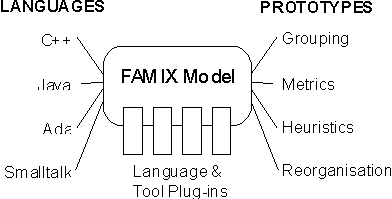 The FAMOOS partners have built a number of tool prototypes for conducting various experiments within those three research areas. However, the source code available for case studies is written in different implementation languages (C++, Ada and to a lesser extent Java and Smalltalk). To avoid equipping all the tool prototypes with parsing technology for all of the implementation languages, a common information exchange model with language specific extensions is specified (see Figure 2). This model has been named FAMIX, standing for FAMOOS Information Exchange Model.
